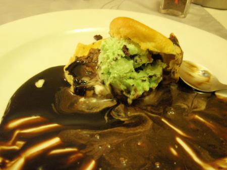 En dessert ,c'est la première fois que je mangeais des profiteroles a la   glace menthe-chocolat;c'est bizarre) il n'y avis plus de glace vanille