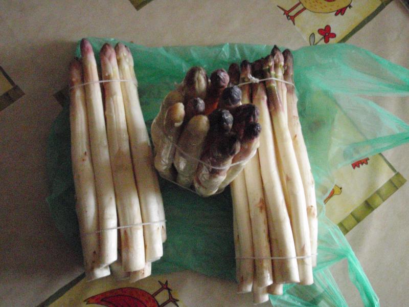 Elles sont arrivées les premières asperges ,tout les ans ,nous les achetons à notre petit producteur qui vient tout les dimanches à Médis (17)les vendre sur le bords de la route ,elles sont délicieuses,cueillies ,le matin pour être vendues l'apres-midi 8€ le kilo ,ce matin à super u elles étaient à 11 €95 et loin d'étre aussi fraîches