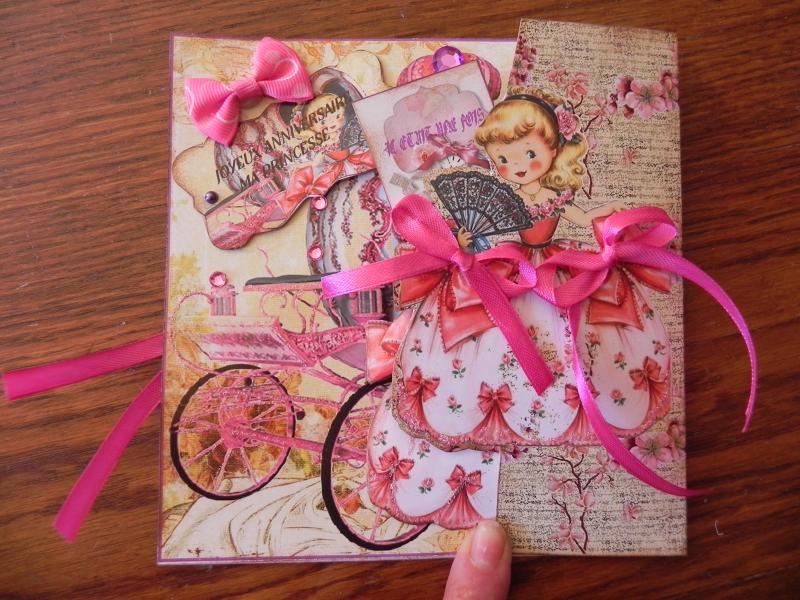 | Mon amie lolo http://creaddictlcanalblog.com ici allez lui rendre visite vous verez des merveilles et sa générositée débordante ma envoyer une carte pour ma petite fille qui va fêter ses 1 an le 13 mars voila une grosse enveloppe Et comme lolo est trés généreuse elle n'a pus s'empecher de me mettre des scrapidules avec une pendouille de porte crochetée par elle Un savon coeur et puis la carte une merveille l'intérieur gros plan sur la princesse le rabat devand le dos avec la petite enveloppe poue y glisser un mot elle m'a même prevue le petit tag pour mon petit mot merci encore mille fois ma lolo tu es un amour merci