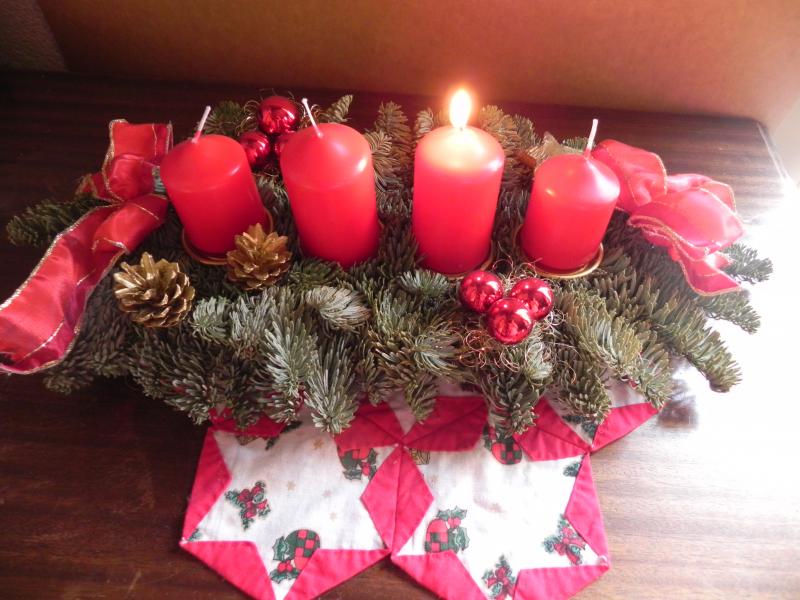 Née au XVIe siècle en Allemagne, la couronne de l'Avent, en forme de cercle, devait rappeler aux Chrétiens le retour annuel et immuable du Christ au mois de décembre. L'histoire raconte que la couronne de l'Avent aurait été inventée au milieu du XIXe siècle, dans un orphelinat d'Hambourg, par le pasteur Heinrich Wichern. Constituée par l'assemblage de plusieurs branches de sapin, de laurier, de houx, de gui, de pommes de pin et de rubans de couleur, elle comporte traditionnellement quatre bougies. Chacune d'entre elles doit être allumée chaque semaine précédant Noël. Traditionnellement, les bougies sont rouges, couleur du feu et de la lumière. En Suède, elles sont blanches et évoquent la pureté tandis qu'en Autriche, elles sont violettes et symbolisent la pénitence. voici la mienne psoée sur le trop joli naperon que m'avais fait ma cath pour notre échange calendrier de l'avent