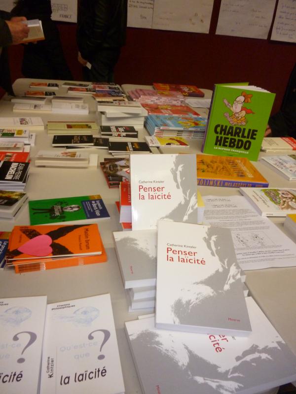 Un stand en hommage aux dessinateurs et chroniqueurs de Charlie Hebdo