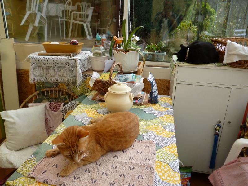 le voila à 18 h.un peu en forme,il a du mal à manger,mais il a quitté le fauteil pour rejoindre Nina dans la véranda, mais interdiction de sortir ...