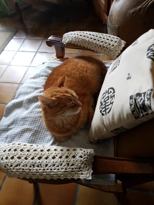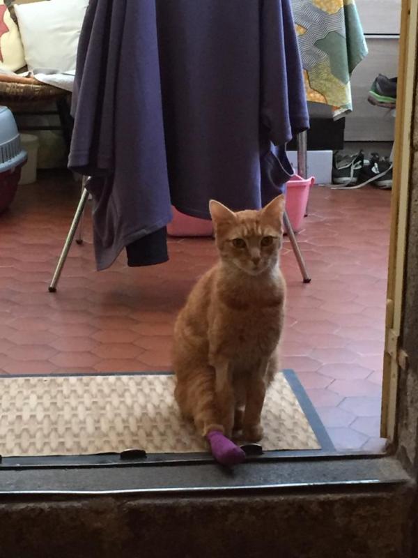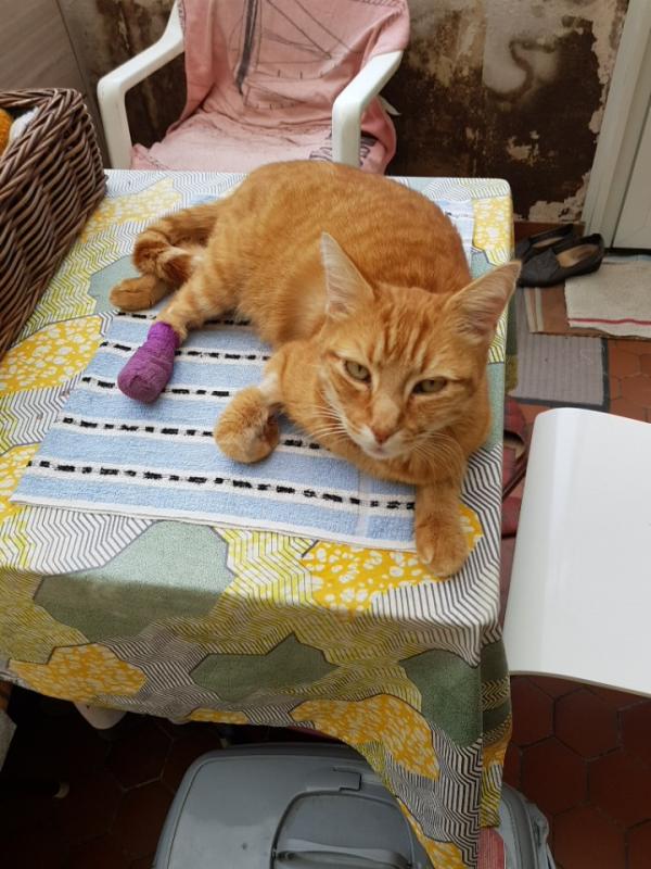Où avait il passé sa patte arrière droite mais le pauvre avait les coussinets ensanglantés,il avait bien mal,mais il se laissait faire en gémissant, donc vétérinaire..il avait une belle plaie,résultat 3 points de suture et médicaments, ce qui est une véritable galère...