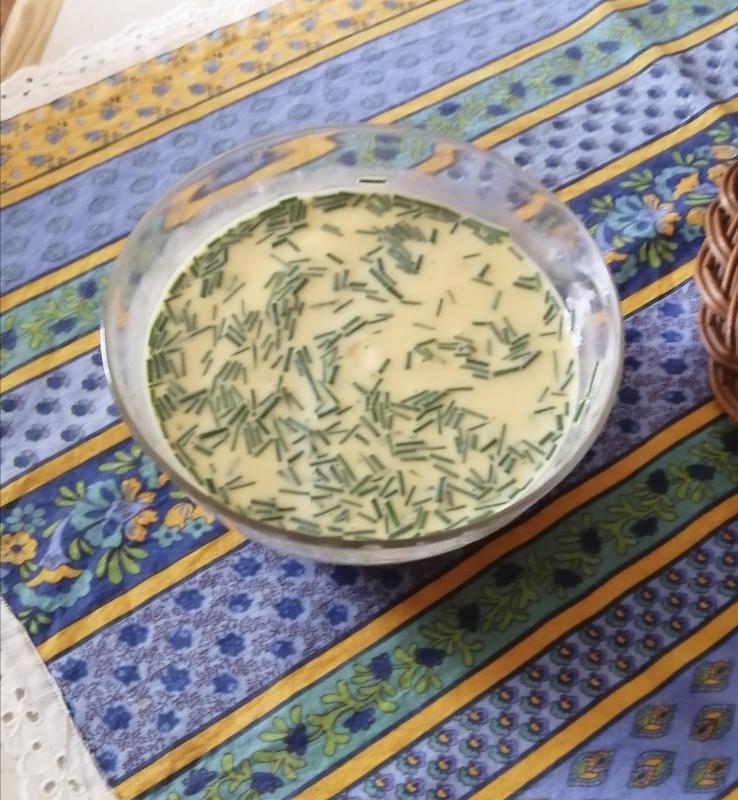 Dans un saladier battu 4 œufs et petit pack de crème, ciboulette, sel poivre.