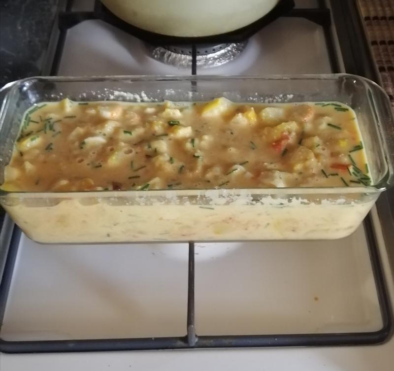 Coupé les bâtonnets de surimi en morceaux de 2 cm. Puis ménagé le tout et, et déposé dans u' moule à cake.