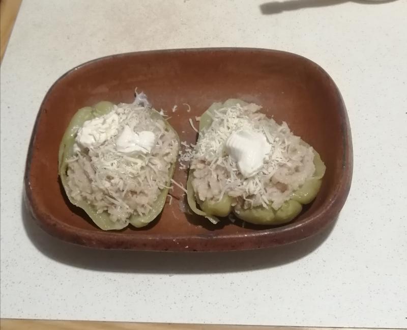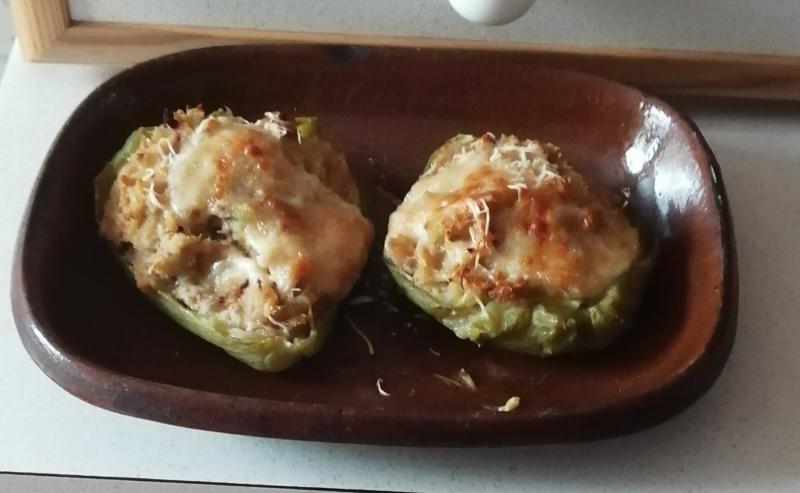 Dénoyautée, et farcie, avec un peu de thon, la chair écrasée, sel poivre,gingembre chapelure.