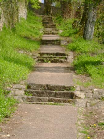 Le chemin menant à la Place du Château où se trouve la salle. Bien sûr on y accède en voiture par le centre ville.