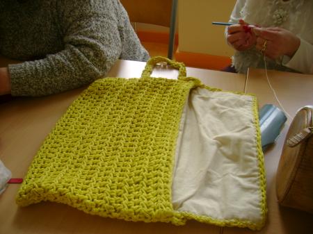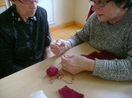 Marie-Thé initie Mado à un nouveau point au crochet .