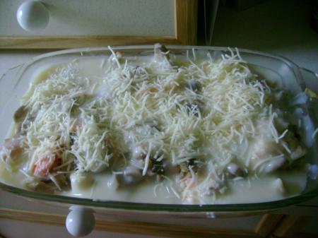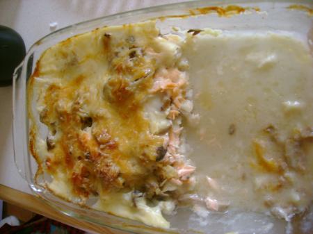 gratin de poisson, crevettes ( merlu cabillaud, saumon, champignon) accompagné de riz basmati