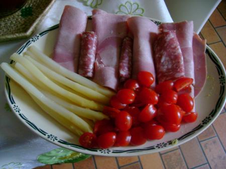 Entrée Foie gras enroulé dans du jambon blanc, saucisson au poivre, asperges et petites tomates.