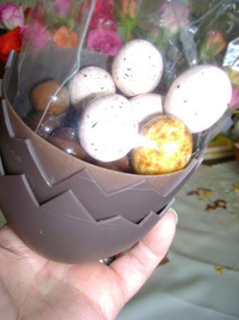 Contenant des petits oeufs en chocolat et de gros oeufs de mouette