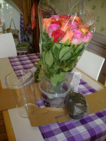 Bien emballé, et mis dans un petit conteneur en plastique avec de l'eau. Un vase était joint avec un sachet pour conserver plus longtemps les fleurs