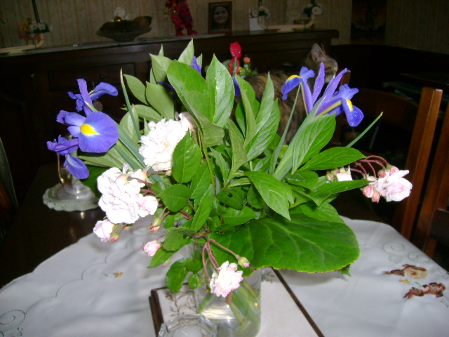 Jevous offre ce petit bouquet ,de roses et d'iris, cueilli ce matin .