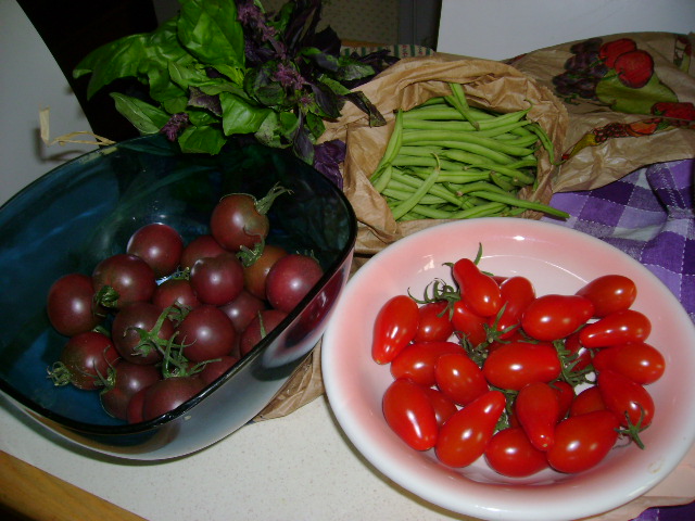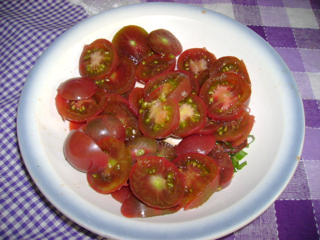 Et je n'ai pu résister : Une bonne salade de tomates, les noires de crimée et du basilic finement ciselé, arrosé d'un filet de vinaigre balsamique ...C'est divin ...