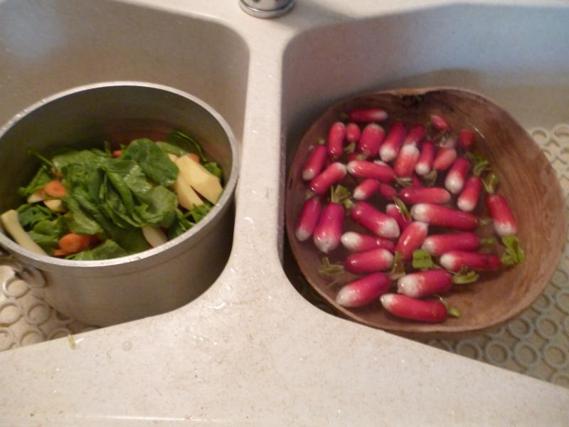 - les voila nettoyés et la soupe est prête: fanes de radis carottes et pommes de terre.