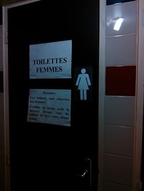 Donc j'avais écrit et collé un mot sur la porte mais hier .. en voulant y aller porte close, j'ai tapé sur la porte en disant que j'étais la seule femme que normalement "mes" wc doivent être libre, je m'apprêtais hélas à me servir de ceux des hommes quand est ressorti de mes toilettes un homme, un parfait inconnu, je lui explique que ce sont les toilettes femmes et voilà que bien sur il ne parle pas français.