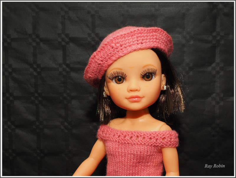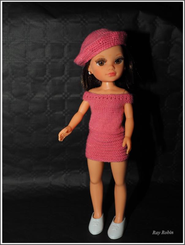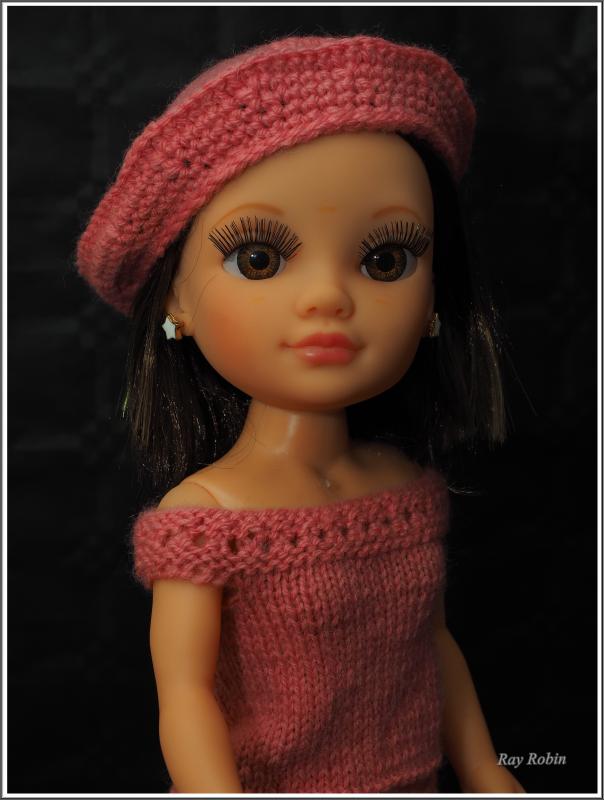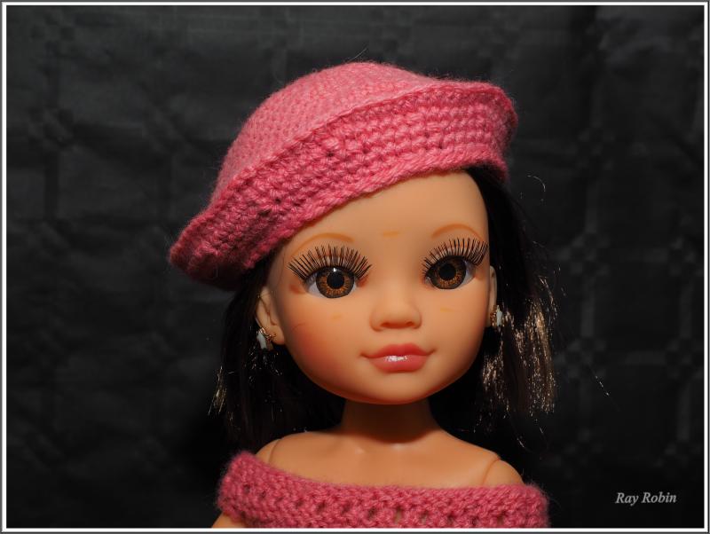 Je l'ai commancé il y a un moment et j'ai eu de la peine à m'y remettre pour la terminer. J'ai donc utilisé un modèle du site stickatillbarbie pour la robe et le béret au crochet est de mon invention
