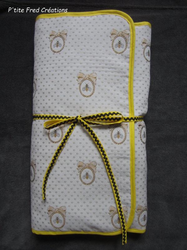 Voici l'extérieur !! tissu avec des abeilles trop beau n'est ce pas et l'intérieur que je n'ai pas encore en photos représente des losanges 3d jaunes et noirs !!
