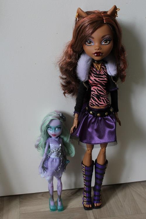 Je parlais donc de ces nouvelles monster high "géante" elles font la taille de ma barbie géante mais comme j'avais mis des photos de cette barbie sans point de repère quelqu'un a été étonnée de la voir en vrai, pour cette monster high je souhaitais donc un comparatif mais comme je n'ai pas réussi à trouver Claudeen (c'est la grande sur la photo) Demonslawa a bien voulu me faire cette photo