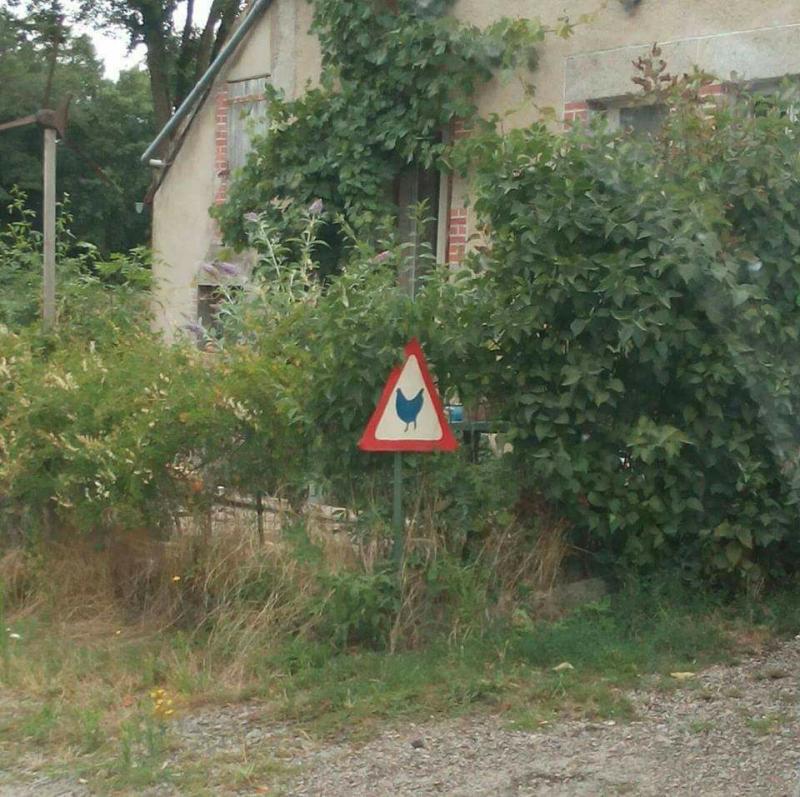je me dis que c'est peut être une bonne idée ce genre de panneau mais aussi je pense que ca indique au renard à 2 pattes qu'il y a des poules dans le quartier