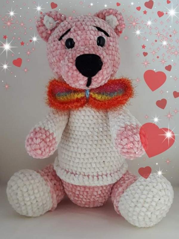 j'ai croisé cette jolie panthère rose, et quand je vois la laine (chenille) je me dis que la personne est tres douée car lorsque j'ai fait mon ours avec cette laine il a fallu que je double pour que le rembourrage ne ressorte pas.