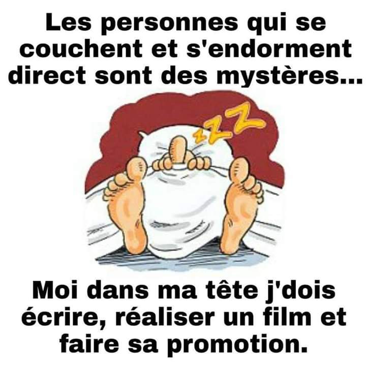 En fait je n'ai pas de mal à m'endormir, en général je tombe comme une masse mais deux heures apres je suis réveillée et plus moyen de dormir, alors oui j'écris un film, je le mets en scene, j'en fais la promotion etc pour arriver à grapiller quelques minutes de sommeil