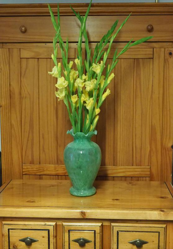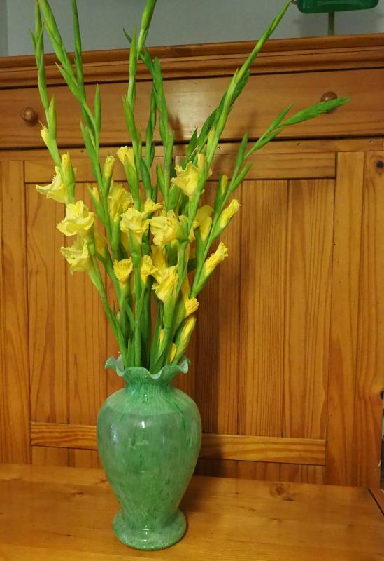 En faisant les courses pour une fois le lidl avait des beaux bouquets de glaïeuls, j'ai pris un bouquet de jaunes pour offrir à ma voisine et dans l'attente à la caisse j'ai discuté avec une dame très gentille qui me dit c'est étonnant le jaune faut aimé moi je n'aime pas le jaune, du coup Ray est retourné chercher des rouges et hop la les jaunes sont pour moi hi hi
