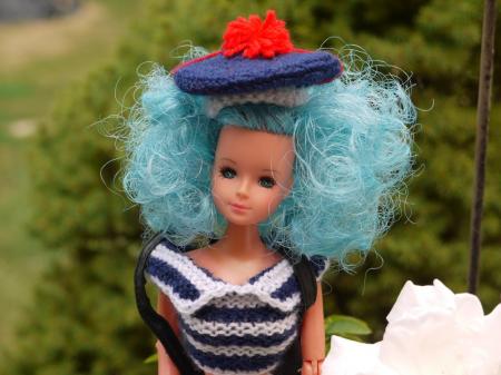 J'ai donc rasé son crane hier et replanté des cheveux bleus, issus d'un masque de clown, apres coup je me suis rendu compte que les cheveux remis ne sont pas de bonne qualité et je n'en n'ai pas eu assez pour faire la tete complète, mais bon avec une bonne permanente et le béret on ne voit pas les "manque"