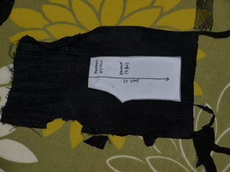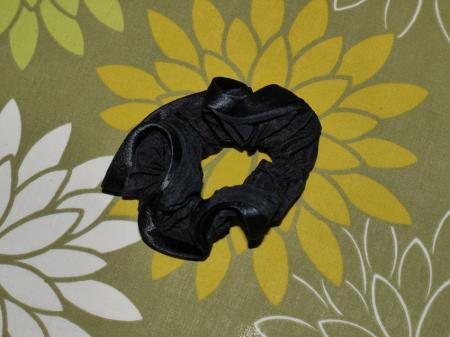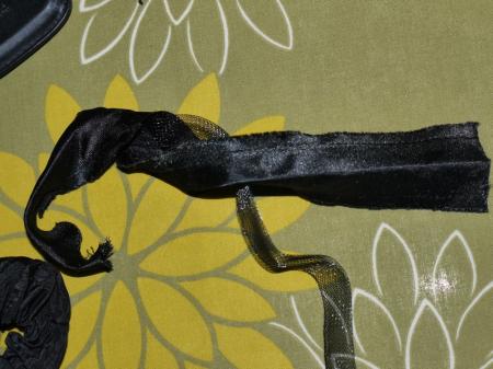 Pour le pantalon, j'ai fini de découdre le chouchou afin de séparer la portion satin du tissus noir fripé, j'ai repassé le tout.