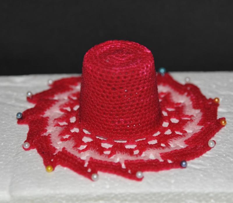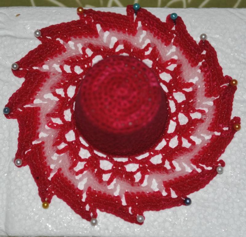 C'est mon homme qui a épinglé le chapeau sur le polystyrene pour qu'il seche bien étendu et que l'on voit bien les "pointes" que cela forme d'ailleurs ca me fait penser à la lame d'une scie circulaire.