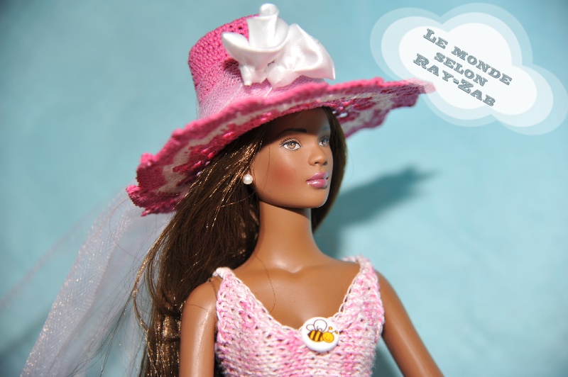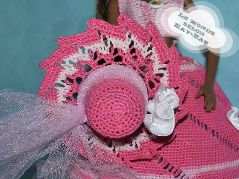 Tout d'abord le chapeau, j'ai emprunté un modèle de napperon et j'ai adapté au chapeau ce dessin au crochet, le chapeau est empesé au sucre agrémenté de tulle et de fleurs tissus blanche