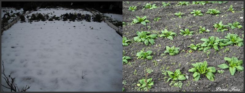 ci dessous, le terrain recouvert de neige à gauche, et le même à droite, ce sont des épinards d'hiver ! ils sont bien vivants , ça pousse !