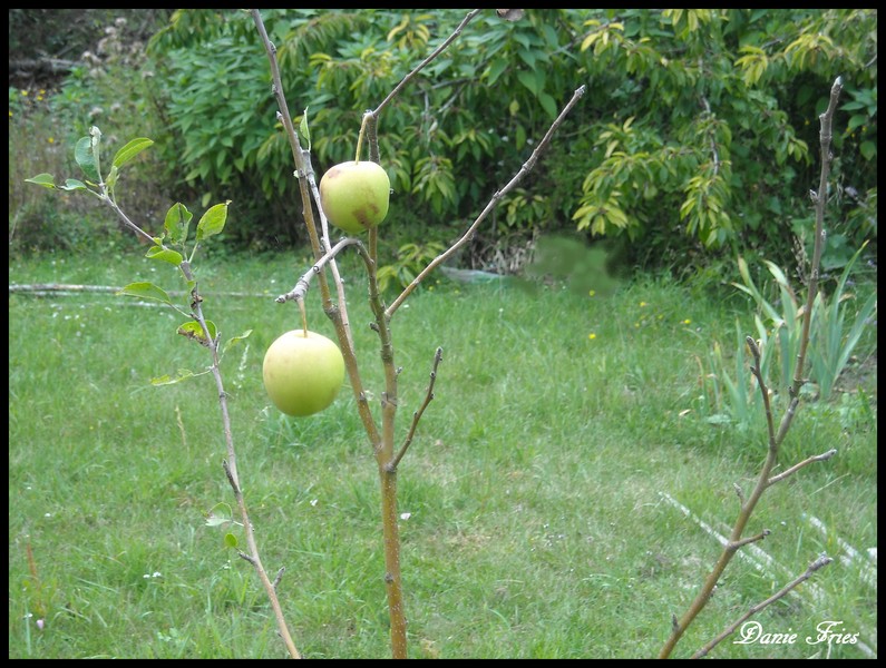 Plus de feuilles sur le pauvre petit pommier, mais deux miniatures de golden qui s'acrochent désespérément à leur branche !