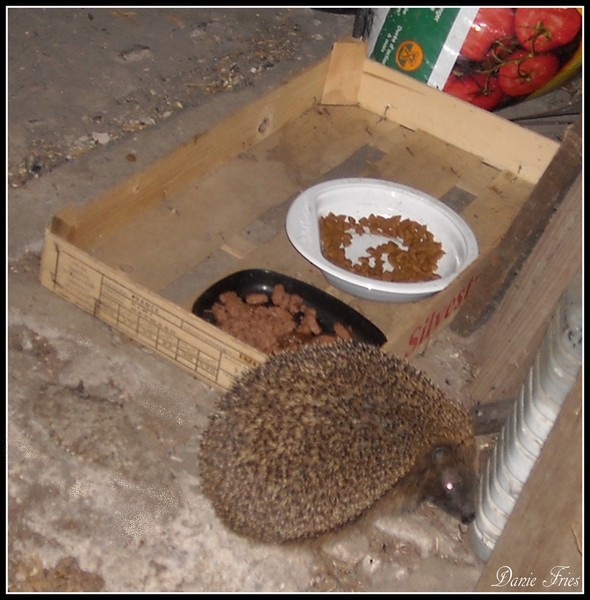 Comme j'ai toujours peur du retour des rats, tous les soirs je surveille, je veille afin de trouver le mangeur de gamelle nocturne, et je ne vois rien... et puis ce soir .... 22h46 exactement, j'avais ma lampe de poche et mon appareil photo , j'attendais en silence et j'entends quelqu'un qui marche dans ls paillages secs, et les feuilles mortes... beuhhhh ! il fait nuit noire ...mais je pose mes doigts sur ma lampe de poche pour ne pas trop éclairer et je vois les feuilles basses du lilas bouger et puis .... ceci ci dessous... oui ! un gros pépère ou mémère je ne sais pas.... Est-ce le petit que j'ai sauvé le 8 aout dernier ?(pour revoir l'article c'est ici ) si oui il a bien grossit ! les croquettes et pâtées de Chouchou lui profite bien, je me demande même si ça lui fait les épines plus douces ? lol ! je n'ai pas voulu l'ennuyer mais le laisser manger tranquillou, pauvre petit, il y en a tellement qui se font écraser sur la route ! et avec ce temps détraqué ça ne doit pas être facile de trouver de quoi manger tous les jours ! ici c'est cool, il a le gite et le couvert ! D'ailleurs j'ai commencé à ramasser des branches mortes etc pour faire des abris pour l'hiver. Avant, il y avait toujours des hérissons qui campaient à la mauvaise saison, dans l'abri des mes oies ... je n'ai plus d'oies, mais un hérisson de retour... il arrive juste aux plats... vite dans le noir au pif j'appuie sur le bouton, photo avec flash, il a peur, c'est logique,la lumière est trop forte, ..je le laisse tranquille.