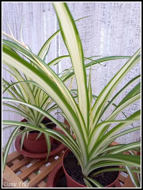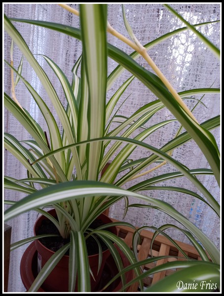 Pour le moment on ne voit pas encore "les petites araignées " qui en fait sont de futures boutures ; mais si vous regardez bien la photo vous verrez que cela ne va plus tarder. Dès qu'elles seront nées, j'ajouterai une photo.