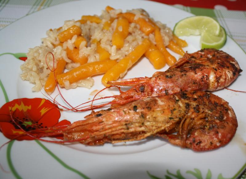 J'ai fait mariner ces gambas environ 2 heures dans de l'huile d'olive, avec 2 gousses d'ail écrasées et du persil, avant de les faire griller sur la plancha.