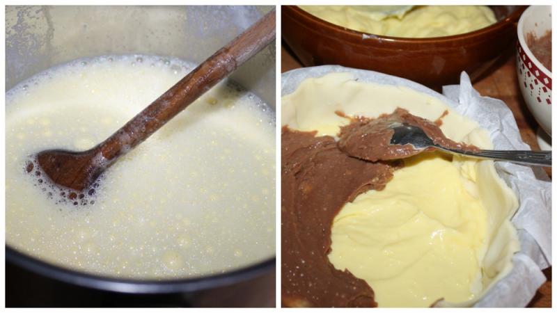 Répartir ce mélange dans 2 récipients, dans l'un ajoutez 15 cl de crème liquide en mélangeant bien, et dans l'autre 10 cl de crème et 4 cuillères à soupe de cacao.