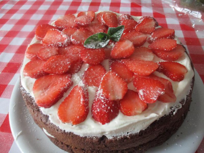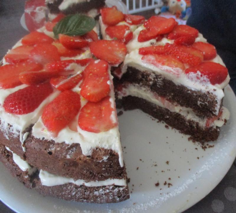 Voici la recette; Préchauffer votre four à 180° Faire fondre le beurre avec le chocolat au bain-marie. Séparer les blancs des jaunes, fouetter les jaunes avec le sucre jusqu'à ce que le mélange blanchisse et devienne mousseux, puis incorporer la farine et la levure en pluie, ajouter ensuite le chocolat et le beurre fondu. Monter les blancs en neige très ferme , puis les incorporer à la préparation précédente en plusieurs fois, pour ne pas les casser. Verser dans un moule bien beurré (ou tapissé de papier sulfurisé) et enfourner une quarantaine de minutes. Laissez refroidir, couper votre gâteau en deux; tartiner de chantilly et recouvrer le tout de fraises; poser la seconde partie du gâteau et recommencer l'opération.