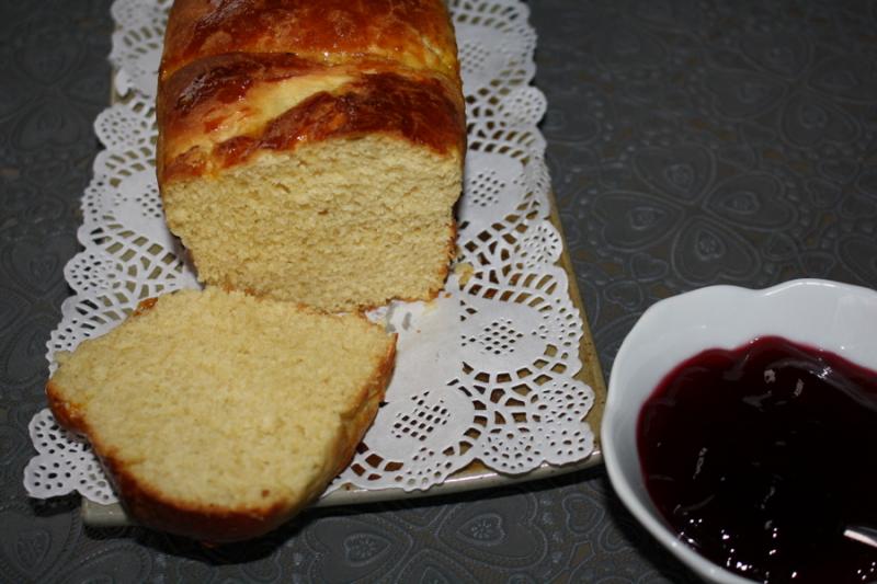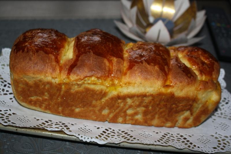 Voici les ingrédients; - 330 g de farine - 40 g de sucre - 8 g de sel fin - 2 sachets de levure boulangère chabrior (ou une autre marque!) - 175 ml de lait - 1 œuf - 75 g de beurre mou Dans un saladier (au robot, pour moi), mélangez la farine avec le sucre, le sel, faites un puit et ajoutez les 2 sachets de levure, mélangez bien le tout, versez ensuite lentement le lait tiède (pas chaud!!!), l'œuf battu en omelette et le beurre ramolli. Bien pétrir pendant une dizaine de minutes; ou 6 minutes au robot afin d'obtenir une pâte lisse. Couvrir d'un torchon et laisser reposer une trentaine de minutes dans un endroit chaud; j'ai laissé monter 1 heure 30! Former ensuite 4 boules, les déposer dans un moule à cake beurré (chemisé de papier sulfurisé, en ce qui me concerne), laisser de nouveau lever la pâte une heure, voire plus, il faut qu'elle double de volume. Badigeonnez avec un jaune d'œuf battu et enfounez dans un four préchauffé à 180 ° pendant 25 minutes. Si vous êtes comme moi, toujours avides de conseils, en voici quelques-uns, trouvés dans la revue Maxi-cuisine pour réussir une bonne et belle brioche! Il suffit de cliquer sur ce LIEN. Et voici une brioche savoureuse sans attendre de longues heures pour la déguster!