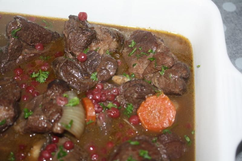 Egouttez les airelles et les réserver, récupérer leur jus, et  l'ajouter dans la cocotte, assaisonner à votre convenance, ajoutez les herbes et épices, couvrir et cuire à feu doux, en remuant régulièrement pendant 2 h à 2 h 30...voire plus, tout dépend de l'âge de la bébête...à surveiller donc, sachant que ce plat peut être réchauffé, il n'en sera que meilleur!