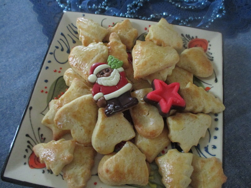 Découpez les biscuits avec des petits emporte-pièces, et déposez-les sur la plaque du four recouverte de papier cuisson, badigeonnez-les du jaune d'œuf battu et enfournez pendant 8 à 10 minutes; ils doivent être légèrement dorés.