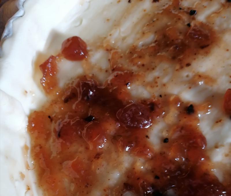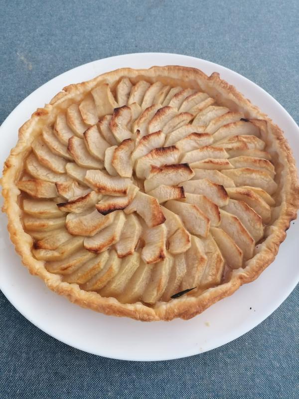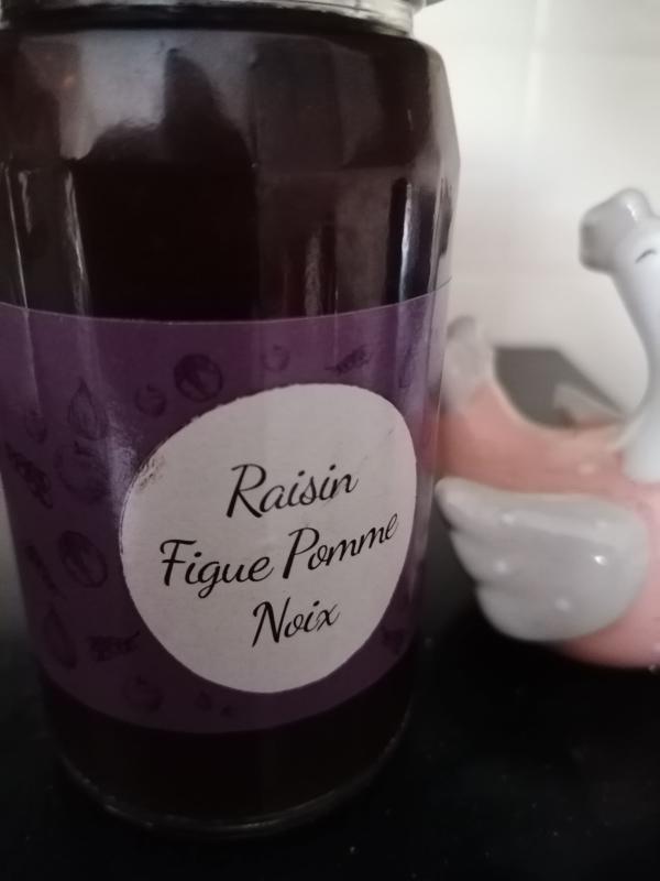 J'ai retrouvé au fond d'un placard un pot de confiture 'raisins, figue, pomme et noix', j'ai décidé de l'utiliser pour améliorer une tarte aux pommes !