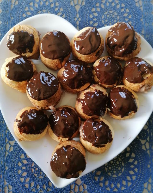 Certains offrent des chocolats, des fleurs, de la lingerie, vont au restaurant... que sais-je encore ! Et bien, rien de tout çà pour moi... je lui ai offert des choux !!! Mais pas n'importe quels choux ; non, des petits choux confectionnés avec amour, (bien sûr, lol) fourrés à la crème pâtissière au chocolat, il adore... et il était ravi !!!