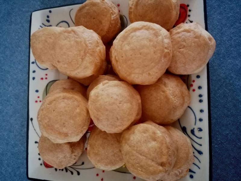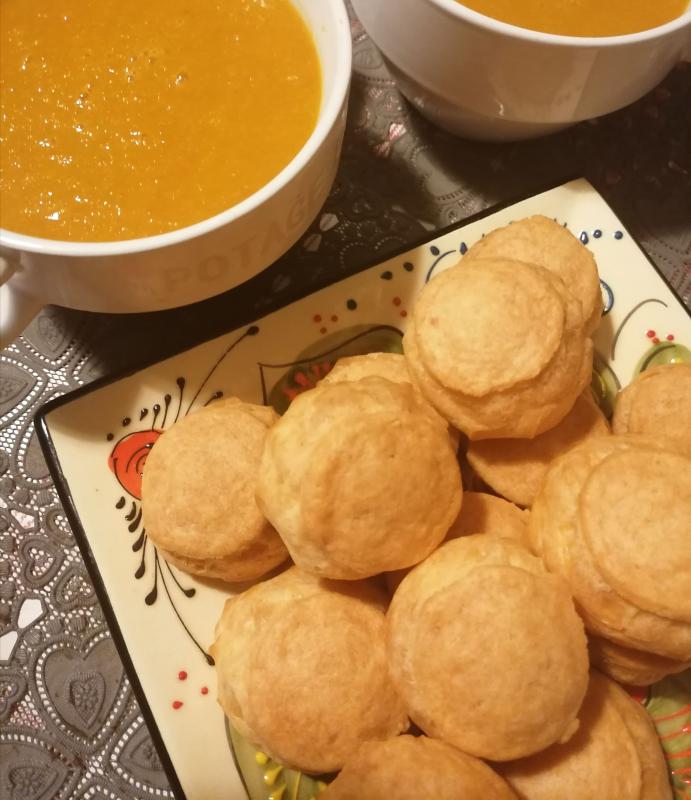 | J'aime faire des petits choux, et aujourd'hui, je vous propose des choux salés (gougères) au comté (ou tout autre gruyère) recouvert d'un craquelin au parmesan; ce petit 'chapeau' permet au chou de gonfler d'une façon très régulière, mais ce petit chapeau croquant est aussi délicieux!  Pour réaliser ces gougères en pâte à choux, j'utilise la même recette et la même façon de faire que pour mes choux sucrés! La recette est SOUS CE LIEN. Bien sûr, je remplace le sucre par 40 à 50 g de comté; et je fais la même chose pour le craquelin, je remplace la cassonade par 50g de parmesan.   Ces gougères sont délicieuses à l'heure de l'apéro, mais aussi servies avec un potage!