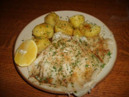 Je l'ai donc préparée au court-bouillon, j'ai fait chauffer le beurre jusqu'à ce qu'il ait une couleur 'noisette' ,j'ai pressé un citron entier (la moitié d'un par part), que j'ai ajouté au beurre et j'ai servi ce plat, comme d'habitude avec des pommes de terre cuites à l'eau parsemées de persil haché.