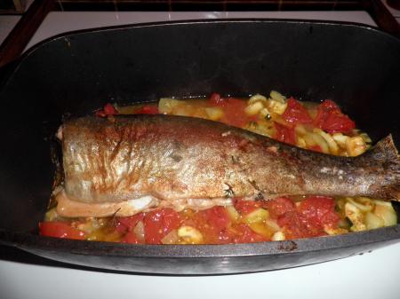 Simplement braisée dans le four, dans un plat en fonte, mais,sur un lit de courgettes et de tomates coupées en cubes avec des échalotes émincées......