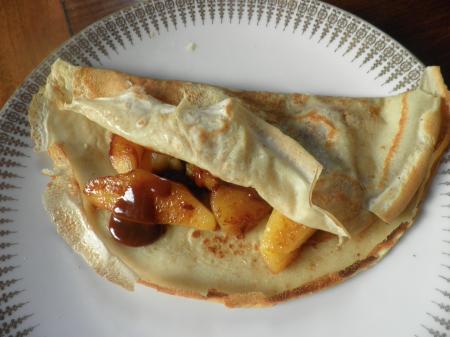 Vous posez ces quartiers de pommes sur une crêpe, vous ajoutez une cuillère de carameldou.