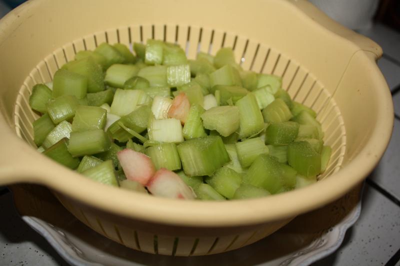 -Epluchez la rhubarbe, coupez-là en tronçons; si les tiges sont grosses, recoupez-les en 2.