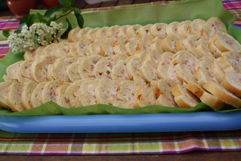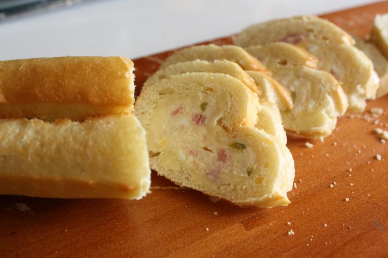 Hier,l'occasion était toute trouvée,car nous étions une vingtaine autour d'un apéro dinatoire (nous fêtions la fête des voisins avec un peu de retard!) Donc,comme Françoise le précisait sur son blog;j'ai préparé cette baguette farcie la veille et je l'ai coupée en tranches juste avant de servir.... Je dois dire qu'elle a eu beaucoup de succès.... Si cette recette vous interesse;allez donc faire un tour sur le blog de Françoise,"La guillaumette" Par rapport à la recette de Françoise,j'ai mis moitié jambon blanc et moitié lardons-allumettes fumés (dorés au préalable dans une poële) Non seulement c'est délicieux,mais c'est un sacré avantage de pouvoir préparer ce pain la veille!
