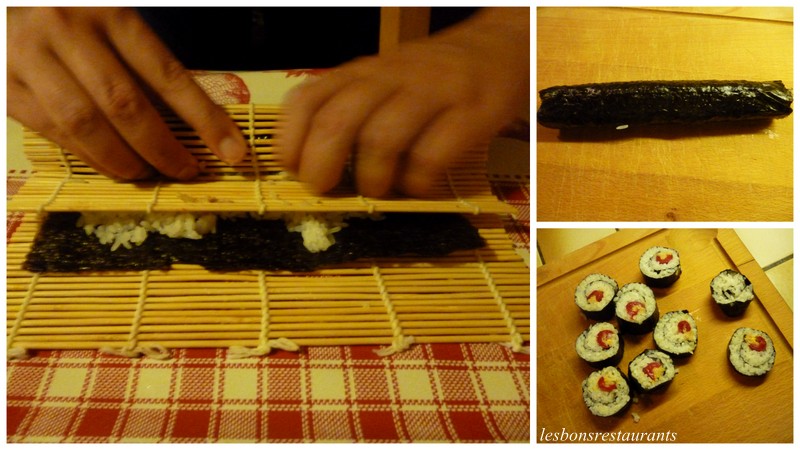 Vous soulevez le bord de la natte et, au fur et à mesure que vous roulez le maki, vous serrez la natte. Lorsque le maki est tout à fait enroulé, serrez bien sur la natte afin que le nori colle bien et que le joint se fasse bien. À l'aide d'un couteau bien aiguisé vous découpez le boudin ainsi obtenu et vous obtenez de délicieux makis.